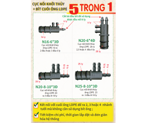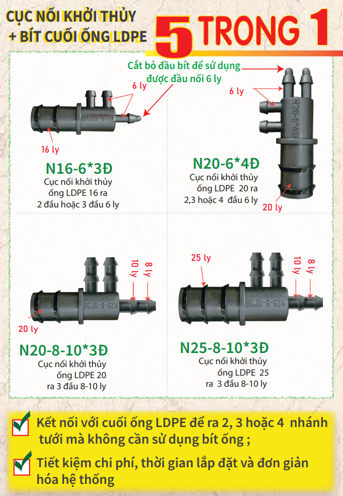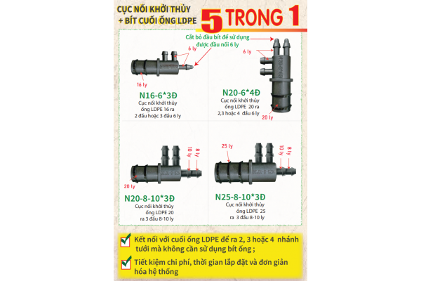 - Dùng để kết nối với cuối ống LDPE để ra 2 hoặc 3 nhánh tưới mà không cần sử dụng bít ống