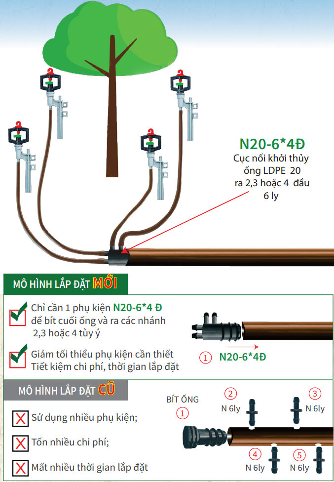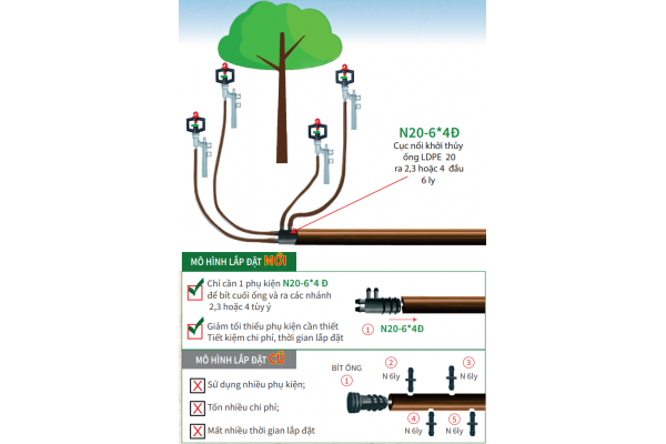 - Chỉ cần 1 phụ kiện N20-8-10* 3Đ để bít cuối ống và ra các nhánh 2 hoặc 3 tùy ý